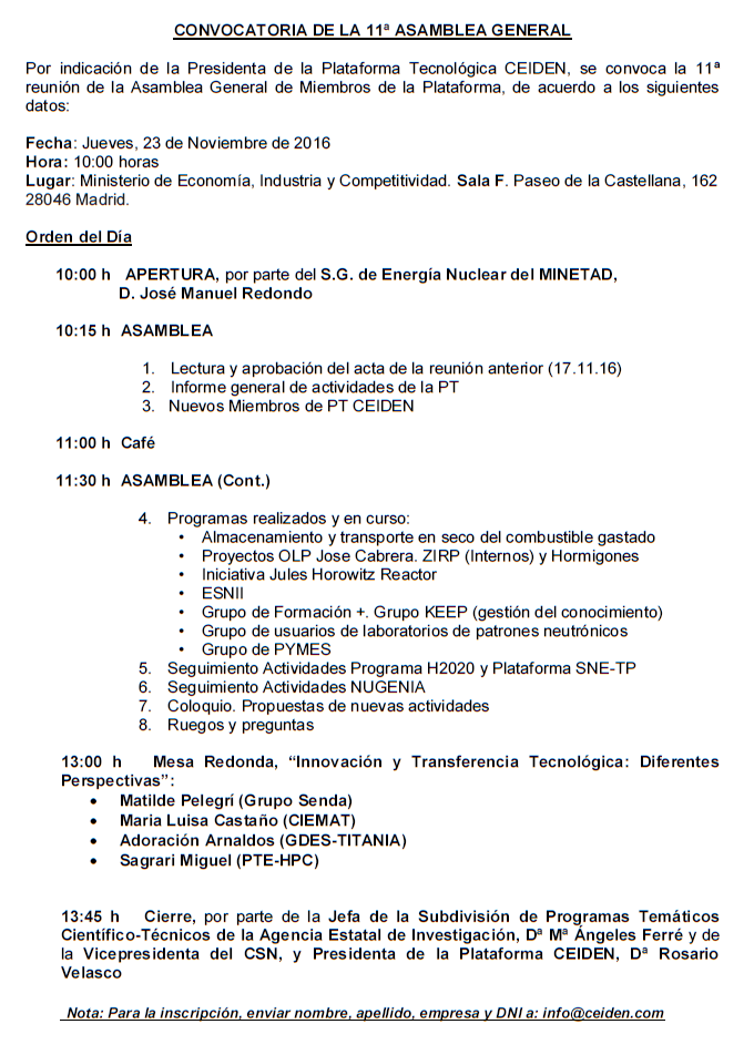 El próximo jueves 23 de Noviembre, a las 10:00, celebraremos la 11ª Asamblea General del CEIDEN en la sede del MINECO (Sala F. Paseo de la Castellana, 162. Madrid). Contaremos en la apertura con el Subdirector General de Energía Nuclear del MINETUR, D. José Manuel Redondo, y con la celebración de la Mesa Redonda, “Innovación y Transferencia Tecnológica: Diferentes Perspectivas”.